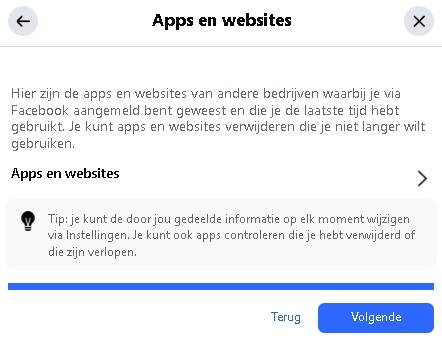 In dit scherm kan je er voor kiezen om bepaalde apps of websites waar je ooit mee bent verbonden te verwijderen of klik op > om de lijst te raadplegen of 'Volgende' .