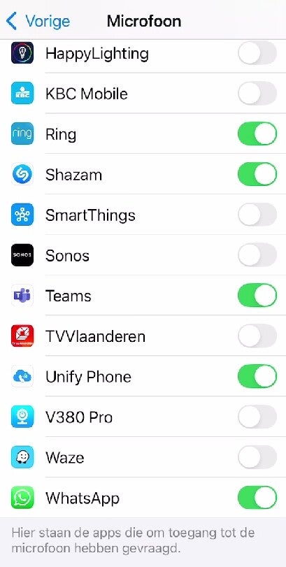 Tik op de schakelaar naast de app waarvan je de microfoontoegang wilt uitschakelen, zodat deze grijs wordt. (Als de schakelaar grijs is, heeft de app geen toegang meer tot de microfoon)